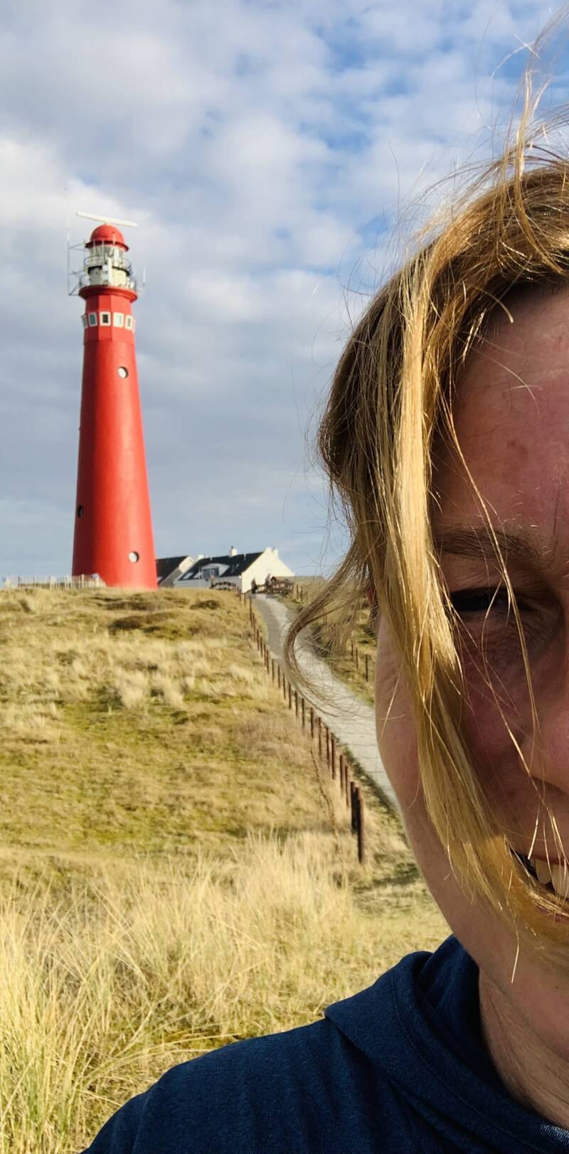 Tijdens mijn warming-up ga ik op zoek naar een geschikte heuvel. Die vind ik bij de rode vuurtoren van Schier.