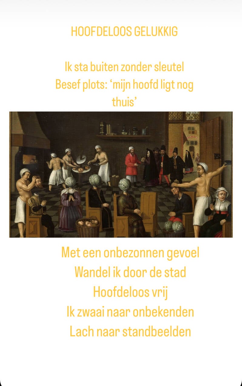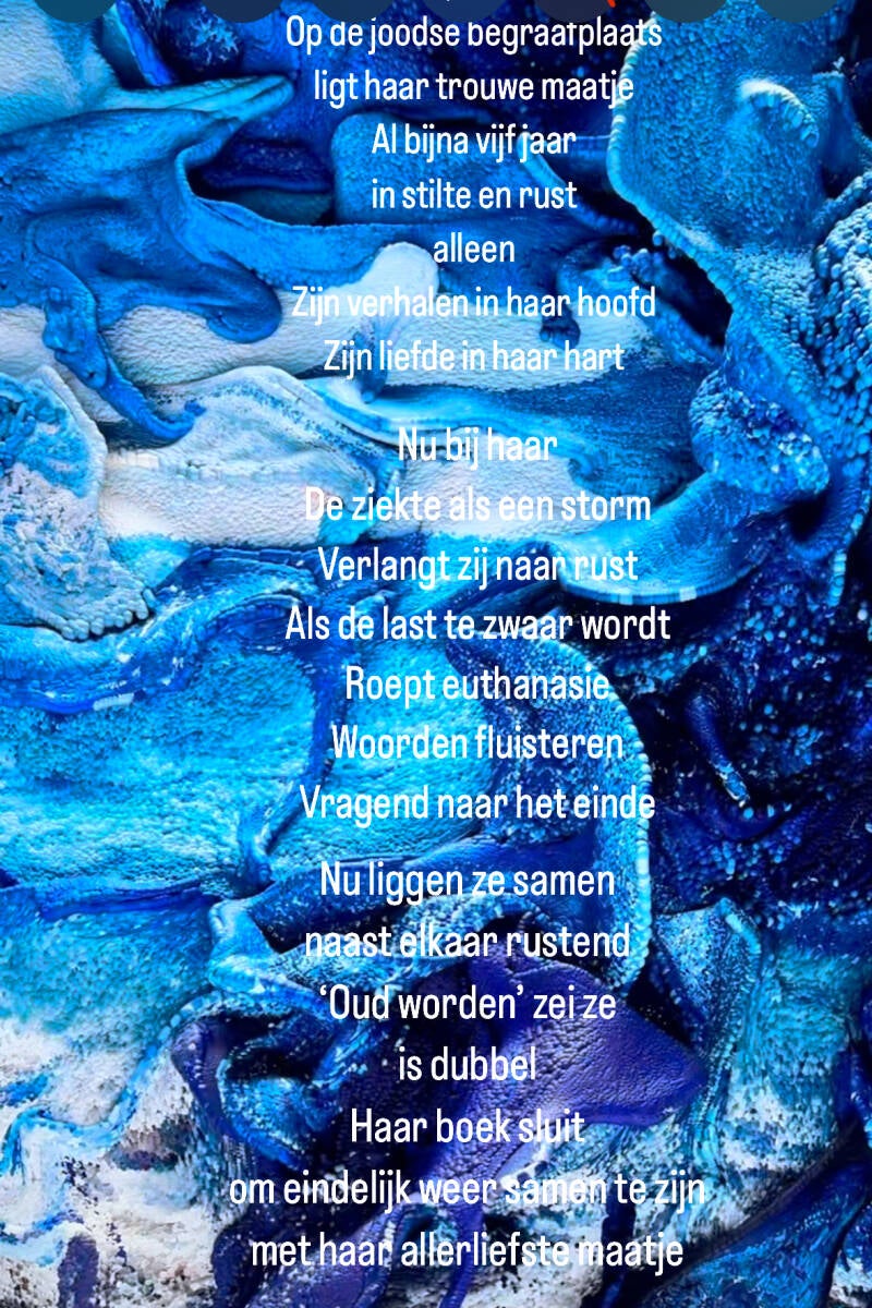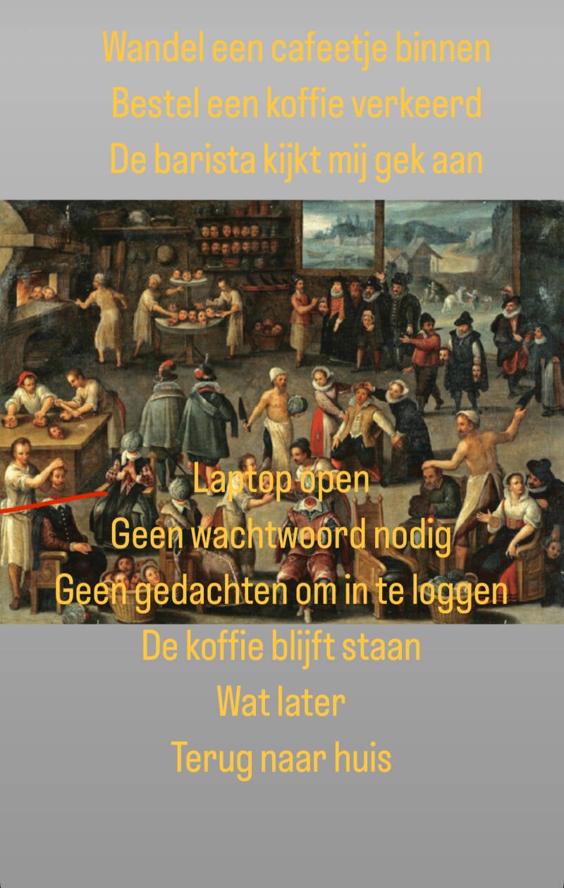 Daar liggen we, hoog boven de straat,op ons dakterras, onder een hemel van zacht gedempt stadlicht.De vliegtuigen die overdag de lucht doorracen zijn tot stilstand gekomen en staan ergens geparkeerd, wachtend op de nieuwe morgen. Af en toe horen we een nachtbewoner op twee of vier wielen.En ook een tortelend meeuwenstel cirkelt krijsend rondjes boven ons hoofd.